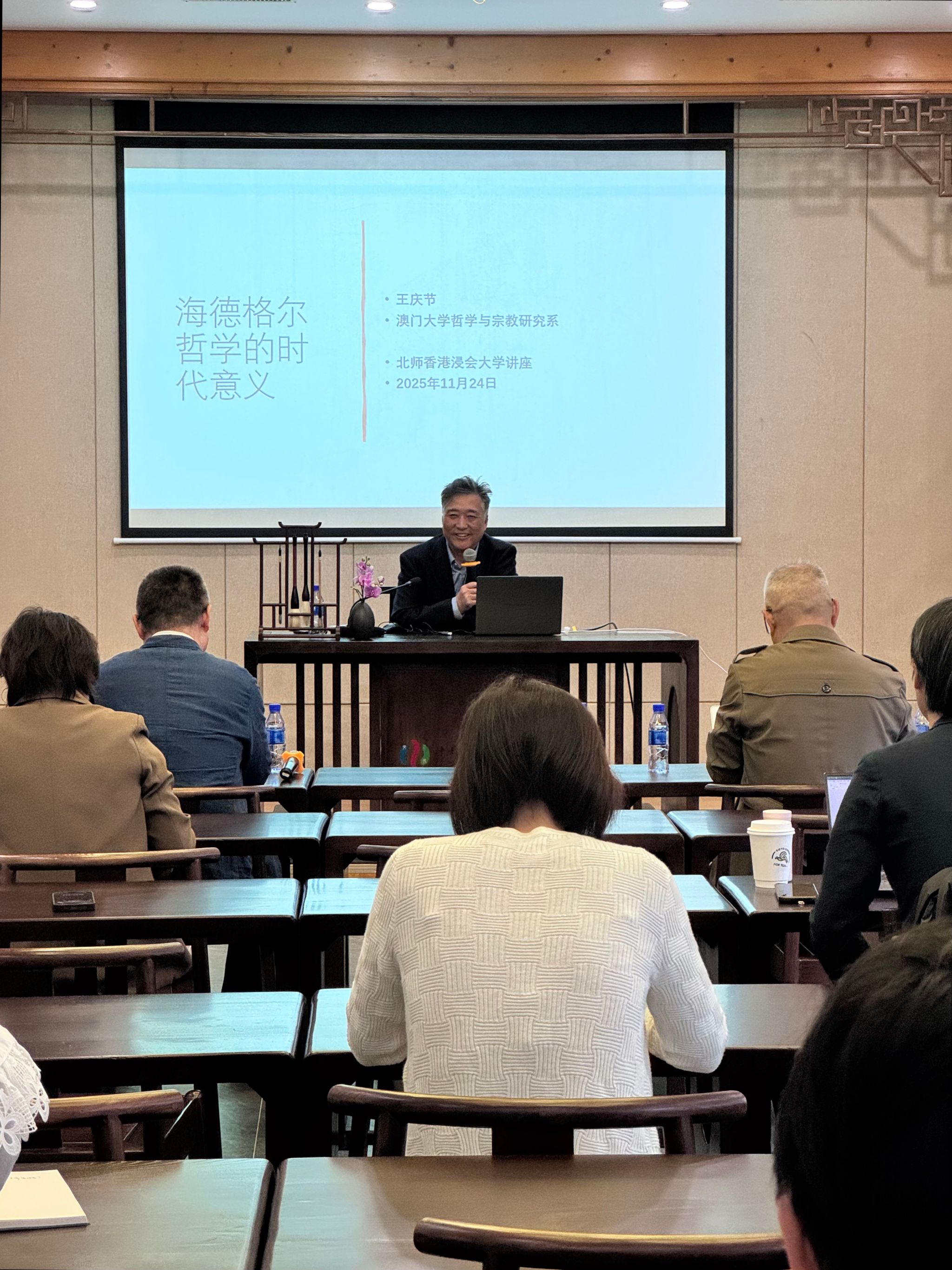 2025年11月24日,澳门大学哲学与宗教学系特聘教授、吉林大学匡亚明人文讲座教授王庆节应邀做客我校,以“海德格尔哲学的时代意义”为题开展学术讲座。这场思想深邃的分享,为现场师生奉上了一场兼具理论厚度与时代关怀的哲学盛宴。本次讲座由北师港浸大高等研究院怀特海研究中心主办,是该中心精心打造的第十一期学术讲座。