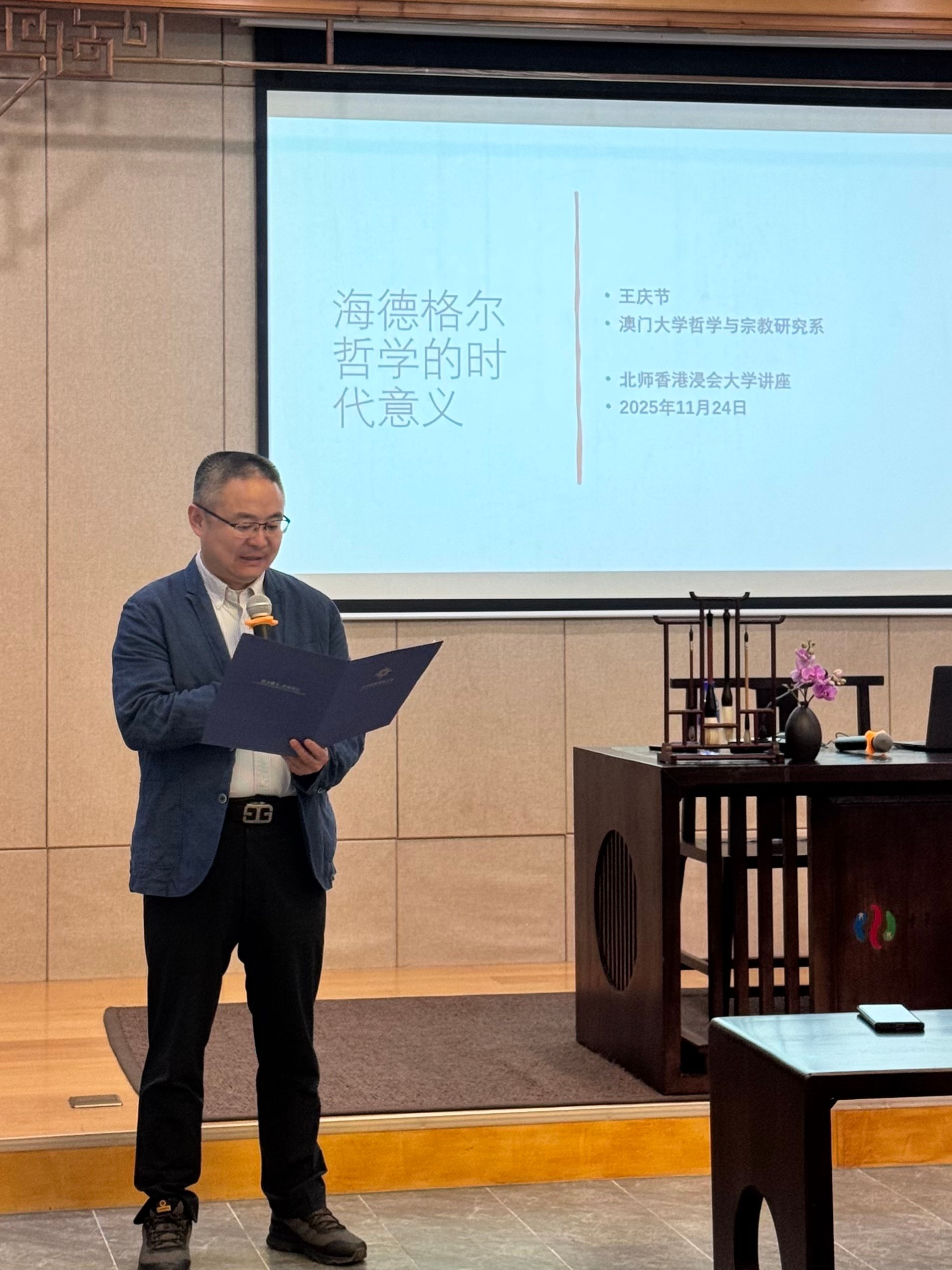 2025年11月24日,澳门大学哲学与宗教学系特聘教授、吉林大学匡亚明人文讲座教授王庆节应邀做客我校,以“海德格尔哲学的时代意义”为题开展学术讲座。这场思想深邃的分享,为现场师生奉上了一场兼具理论厚度与时代关怀的哲学盛宴。本次讲座由北师港浸大高等研究院怀特海研究中心主办,是该中心精心打造的第十一期学术讲座。