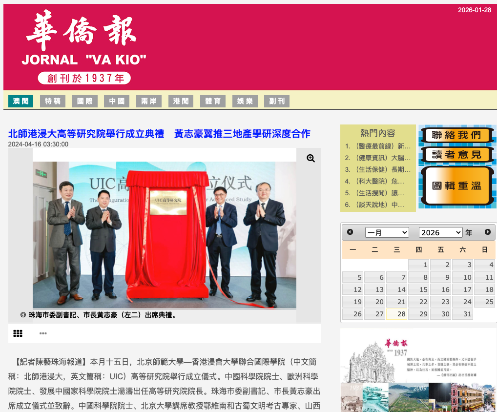 2024/04/16[華僑報] -- 北師港浸大高等研究院舉行成立典禮 黃志豪冀推三地產學研深度合作