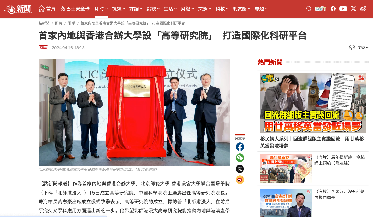 【點新聞報道】作為首家內地與香港合辦大學,北京師範大學-香港浸會大學聯合國際學院(下稱「北師港浸大」)15日成立高等研究院,中國科學院院士湯濤出任高等研究院院長。珠海市長黃志豪出席成立儀式致辭表示,高等研究院的成立,標誌着「北師港浸大」在前沿研究交叉學科應用方面邁出新的一步。他希望北師港浸大高等研究院能推動內地與港澳產學研深度合作,為粵港澳大灣區的建設貢獻力量。