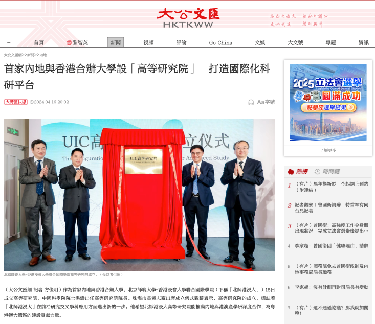 (大公文匯網 記者 方俊明)作為首家內地與香港合辦大學,北京師範大學-香港浸會大學聯合國際學院(下稱「北師港浸大」)15日成立高等研究院,中國科學院院士湯濤出任高等研究院院長。珠海市長黃志豪出席成立儀式致辭表示,高等研究院的成立,標誌着「北師港浸大」在前沿研究交叉學科應用方面邁出新的一步。他希望北師港浸大高等研究院能推動內地與港澳產學研深度合作,為粵港澳大灣區的建設貢獻力量。