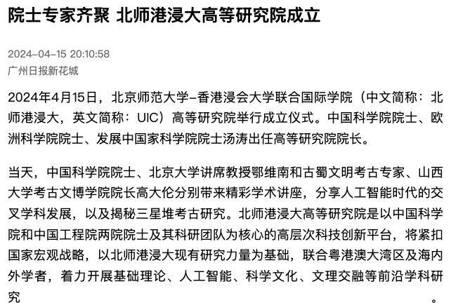 2024年4月15日,北京师范大学-香港浸会大学联合国际学院(中文简称:北师港浸大,英文简称:UIC)高等研究院举行成立仪式。中国科学院院士、欧洲科学院院士、发展中国家科学院院士汤涛出任高等研究院院长。