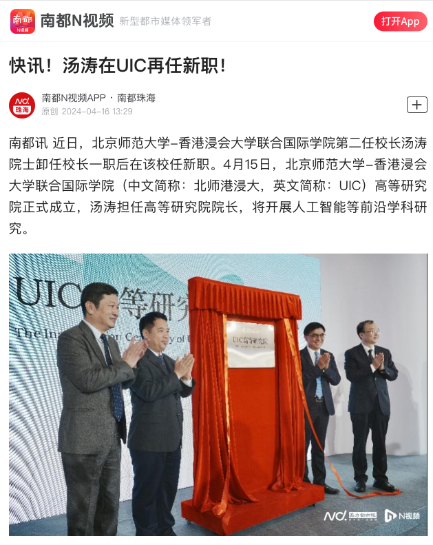 南都讯 近日,北京师范大学-香港浸会大学联合国际学院第二任校长汤涛院士卸任校长一职后在该校任新职。4月15日,北京师范大学-香港浸会大学联合国际学院(中文简称:北师港浸大,英文简称:UIC)高等研究院正式成立,汤涛担任高等研究院院长,将开展人工智能等前沿学科研究。