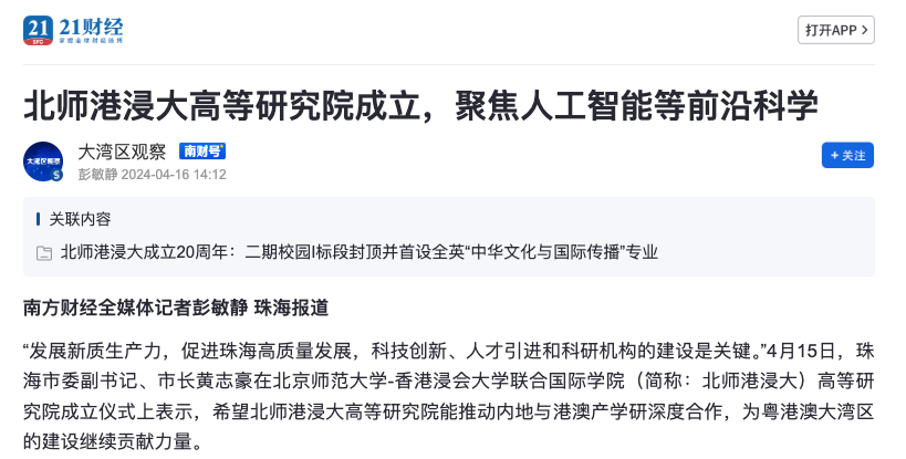 “发展新质生产力,促进珠海高质量发展,科技创新、人才引进和科研机构的建设是关键。”4月15日,珠海市委副书记、市长黄志豪在北京师范大学-香港浸会大学联合国际学院(简称:北师港浸大)高等研究院成立仪式上表示,希望北师港浸大高等研究院能推动内地与港澳产学研深度合作,为粤港澳大湾区的建设继续贡献力量。
