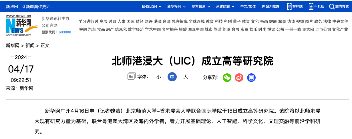 新华网广州4月16日电(记者魏蒙)北京师范大学-香港浸会大学联合国际学院于15日成立高等研究院。该院将以北师港浸大现有研究力量为基础,联合粤港澳大湾区及海内外学者,着力开展基础理论、人工智能、科学文化、文理交融等前沿学科研究。