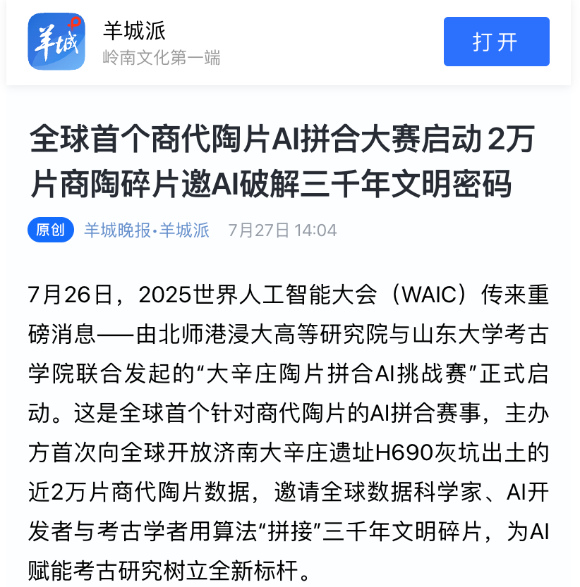 7月26日,2025世界人工智能大会(WAIC)传来重磅消息——由北师港浸大高等研究院与山东大学考古学院联合发起的“大辛庄陶片拼合AI挑战赛”正式启动。这是全球首个针对商代陶片的AI拼合赛事,主办方首次向全球开放济南大辛庄遗址H690灰坑出土的近2万片商代陶片数据,邀请全球数据科学家、AI开发者与考古学者用算法“拼接”三千年文明碎片,为AI赋能考古研究树立全新标杆。