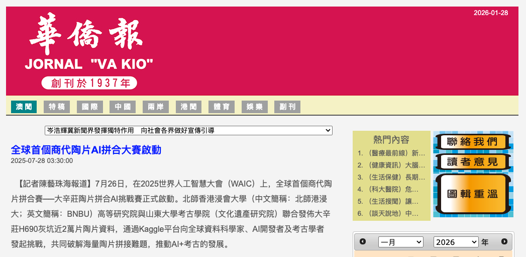 【記者陳藝珠海報道】7月26日,在2025世界人工智慧大會(WAIC)上,全球首個商代陶片拼合賽──大辛莊陶片拼合AI挑戰賽正式啟動。北師香港浸會大學(中文簡稱:北師港浸大;英文簡稱:BNBU)高等研究院與山東大學考古學院(文化遺產研究院)聯合發佈大辛莊H690灰坑近2萬片陶片資料,通過Kaggle平台向全球資料科學家、AI開發者及考古學者發起挑戰,共同破解海量陶片拼接難題,推動AI+考古的發展。