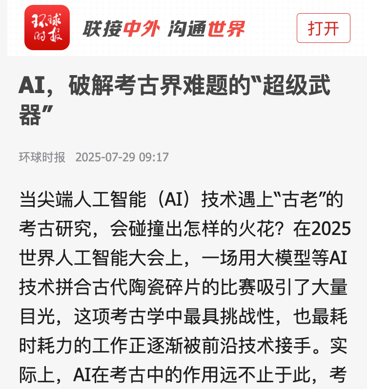 当尖端人工智能(AI)技术遇上“古老”的考古研究,会碰撞出怎样的火花?在2025世界人工智能大会上,一场用大模型等AI技术拼合古代陶瓷碎片的比赛吸引了大量目光,这项考古学中最具挑战性,也最耗时耗力的工作正逐渐被前沿技术接手。实际上,AI在考古中的作用远不止于此,考古学家、北师香港浸会大学高等研究院访问教授荆志淳在大会期间接受《环球时报》记者采访时表示,AI已经成为我们探索物质文化和解读古代社会机制的“新引擎”,展望未来,考古学将迈向全新的“智能时代”。