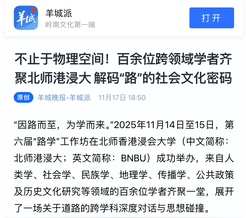 “因路而至,为学而来。”2025年11月14日至15日,第六届“路学”工作坊在北师香港浸会大学(中文简称:北师港浸大;英文简称:BNBU)成功举办,来自人类学、社会学、民族学、地理学、传播学、公共政策及历史文化研究等领域的百余位学者齐聚一堂,展开了一场关于道路的跨学科深度对话与思想碰撞。