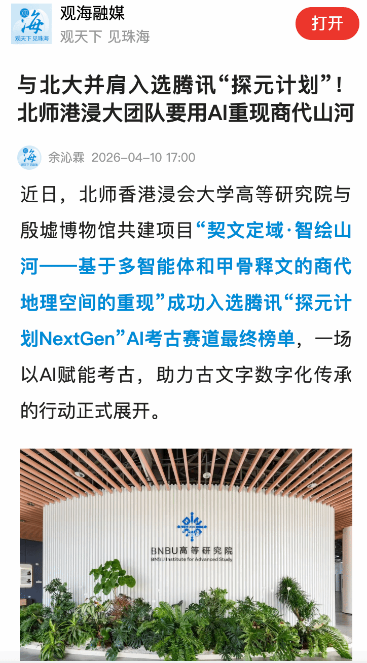 近日,北师香港浸会大学高等研究院与殷墟博物馆共建项目“契文定域·智绘山河——基于多智能体和甲骨释文的商代地理空间的重现”成功入选腾讯“探元计划NextGen”AI考古赛道最终榜单,一场以AI赋能考古,助力古文字数字化传承的行动正式展开。