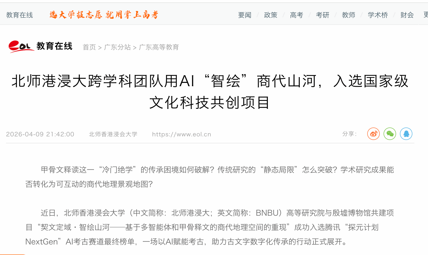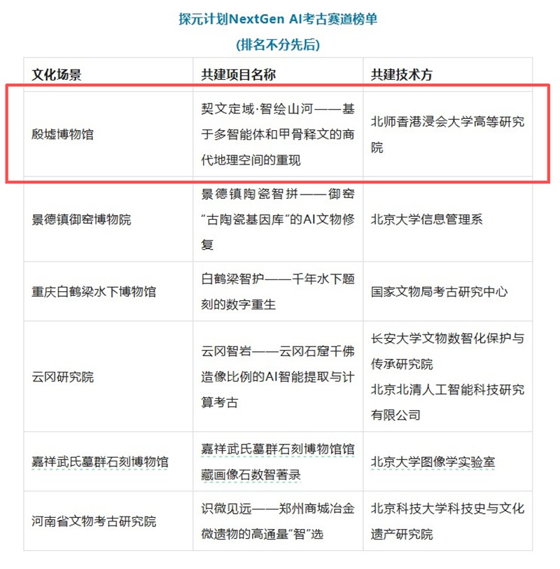 近日,北师香港浸会大学(中文简称:北师港浸大;英文简称:BNBU)高等研究院与殷墟博物馆共建项目“契文定域·智绘山河——基于多智能体和甲骨释文的商代地理空间的重现”成功入选腾讯“探元计划NextGen”AI考古赛道最终榜单,一场以AI赋能考古,助力古文字数字化传承的行动正式展开。