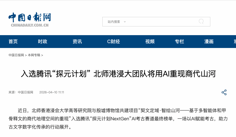 近日,北师香港浸会大学高等研究院与殷墟博物馆共建项目“契文定域·智绘山河——基于多智能体和甲骨释文的商代地理空间的重现”入选腾讯“探元计划NextGen”AI考古赛道最终榜单,一场以AI赋能考古,助力古文字数字化传承的行动展开。