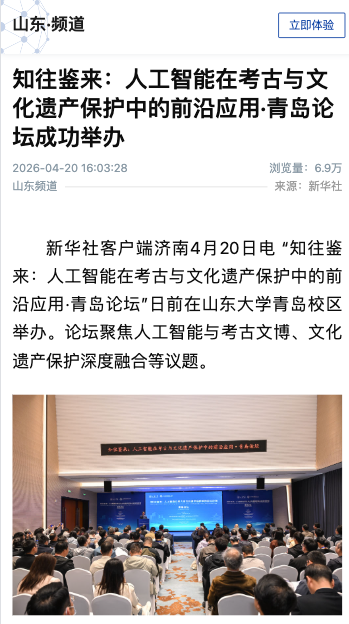 新华社客户端济南4月20日电 “知往鉴来:人工智能在考古与文化遗产保护中的前沿应用·青岛论坛”日前在山东大学青岛校区举办。论坛聚焦人工智能与考古文博、文化遗产保护深度融合等议题。