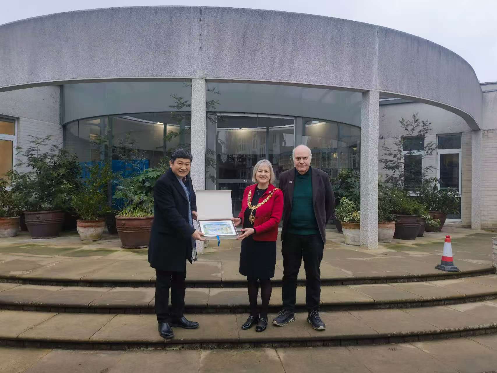 陈致校长向剑桥市长Dinah Pounds伉俪致送纪念品