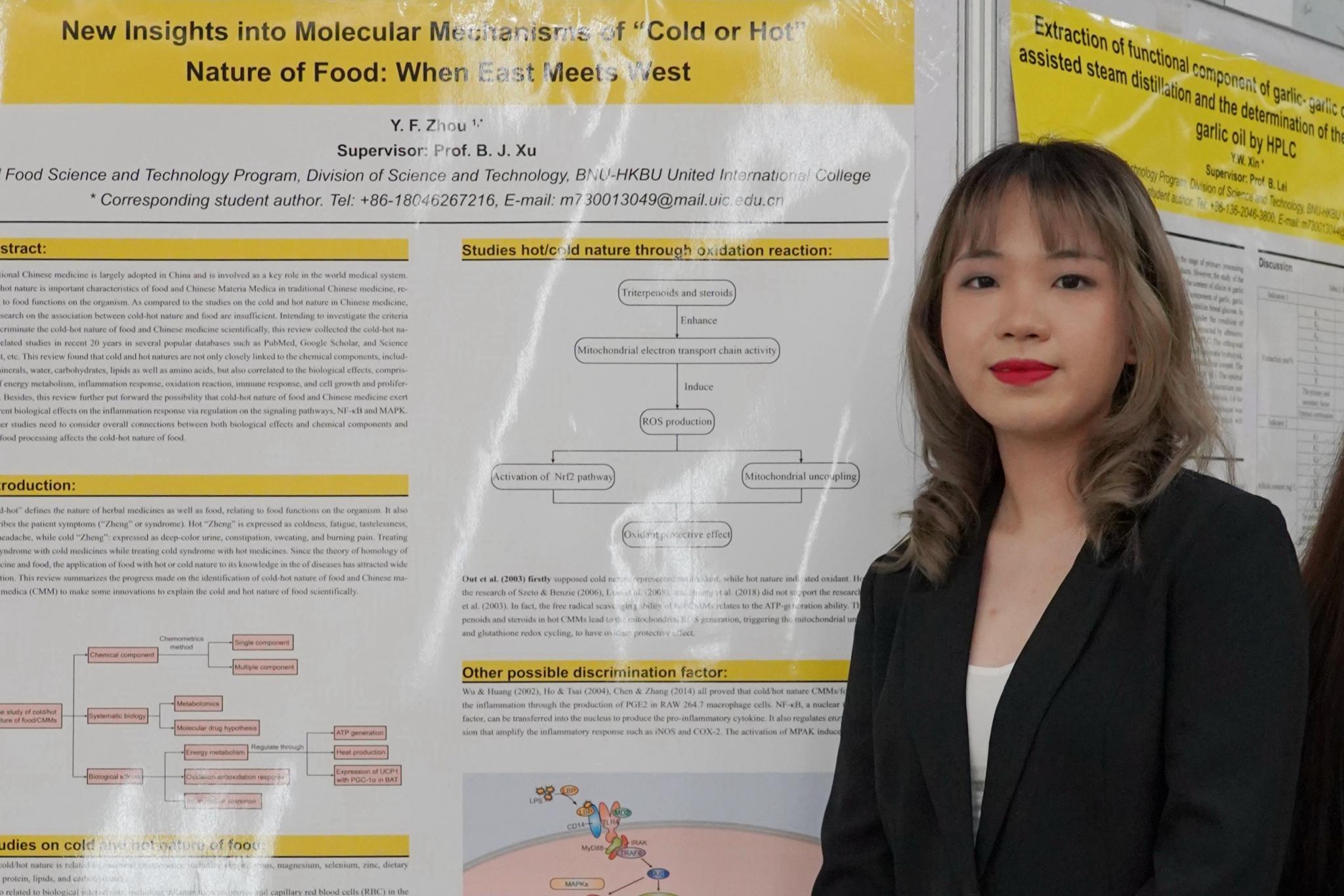 Zhou developed a research interest in food and disease during her undergraduate study. Guided and encouraged by the Head of UIC's Department of Life Sciences, Prof Xu Baojun, she began to conduct review studies on the functional foods such as matsutake and saponins on inflammation, cancer, obesity and diabetes, and accumulated a great deal of knowledge about phytochemistry, biotechnology, and the mechanisms and treatments of chronic diseases. Her thesis, New insights into molecular mechanisms of "Cold or Hot" nature of food: When East meets West, was published in the internationally renowned journal Food Research International.  In the second semester of her final year, she completed another review paper on the signalling pathways of dietary saponins in anti-cancer molecules, and it was published in the international authoritative journal, Critical Reviews in Food Science and Nutrition.